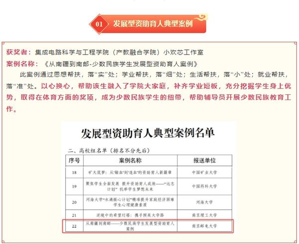 近日,江苏省教育厅组织开展的2024年“苏乡永助”资助育人主题活动评选结果揭晓。我院小欢芯辅导员思政工作室上报的《从南疆到南邮-少数民族学生发展型资助育人案例》获得江苏省发展型资助育人典型案例奖项。