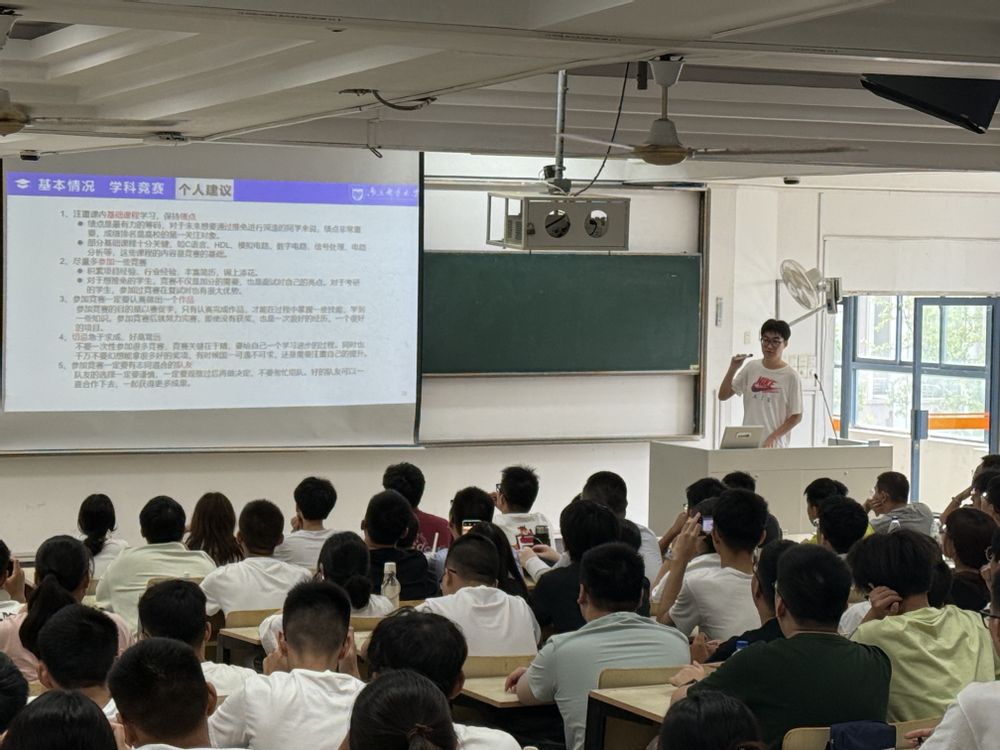 为加强学院学风建设,引导新生树立远大志向、科学规划学业,9月,南京邮电大学集成电路科学与工程学院(产教融合学院)在教2-301、教2-302教室隆重举办新生学风建设教育专题活动。本次活动特邀刘润衎、顾钰、李静窈、赵文博、杨君威、余润萱六位在学术保研、创新保研和支教保研方面取得优异成绩的学长学姐担任主讲嘉宾,面向2025级全体新生分享经验、传递智慧。分享会上,六位同学分别从不同角度为学弟学妹带来精彩而实用的内容。