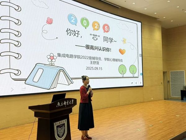 为全面提高学生心理调适能力,助力学生以积极健康的心态迎接大学生活,9月15日,集成电路科学与工程学院(产教融合学院)在运满满报告厅举办新生入学教育之心理健康与适应教育专题讲座。本次活动由2025级新生辅导员林钰程主持,邀请学院2022级辅导员、国家二级心理咨询师、学院心理工作负责人王舒宜老师担任主讲,2025级新生共同参与。