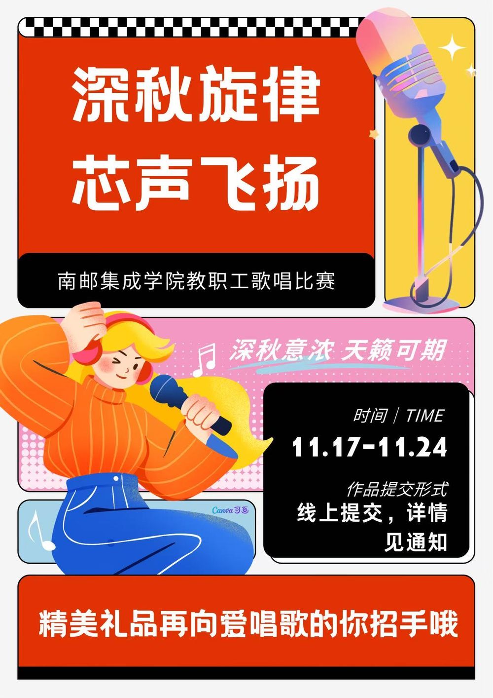 11月17日-24日,集成电路学院举办的“深秋旋律·芯声飞扬”教职工歌唱比赛圆满落下帷幕。本次活动旨在丰富教职工业余文化生活,展现学院教师多才多艺、昂扬向上的精神风貌,得到了老师们的热烈响应。