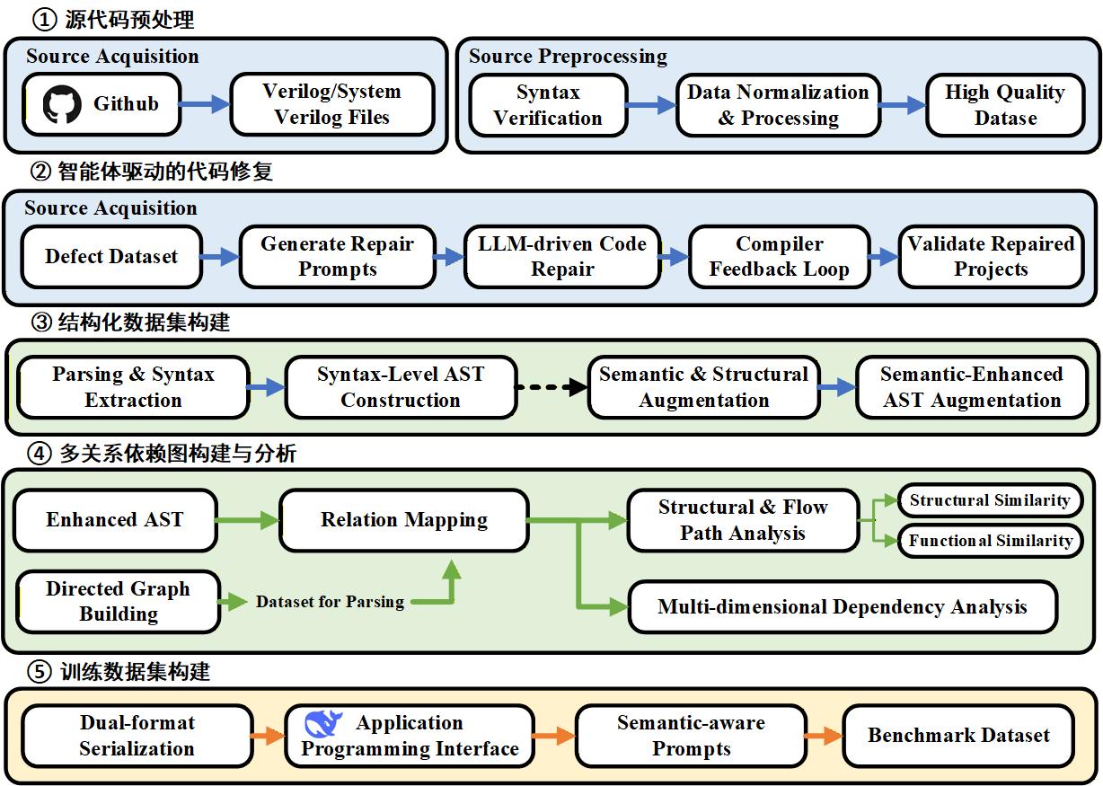 近日,我院郭宇锋教授团队在ACM International Conference on the Foundations of Software Engineering (FSE) 2026 发表创新研究成果“VerilogASTBench: Benchmark Construction of Verilog AST Dataset with Dual-Stage AST Semantic Enhancement Framework” 第一作者为张鲁萍博士,通讯作者为严大鹏老师。该研究针对Verilog代码生成过程中高质量、大规模训练数据集缺失导致语法与功能正确性不足的问题,提出了一种基于抽象语法树的语义增强技术,用于构建高质量的Verilog数据集。该研究从GitHub开源代码库中收集了1,035,777条Verilog代码样本,并对进行数据清洗,最终构建了包含318,021条高质量样本的Verilog数据集。实验结果表明,在该数据集上微调后,CodeQwen-7B在 Verilog 代码生成任务中的准确率提升9.02%,并在 VerilogEval 基准上优于 GPT-4。